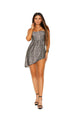 Elegant Moments Bandeau mini dress with asymmetrical hem and back zipper.