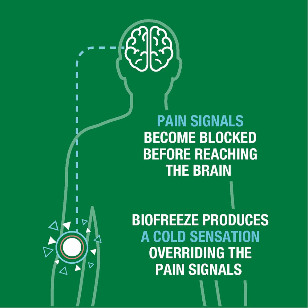 Biofreeze® works through a process known as cold therapy (cryotherapy). The menthol in Biofreeze® creates a cooling sensation that activates sensory receptors, blocking pain signals sent to the brain. This provides temporary, yet powerful relief — without the need for oral medication.