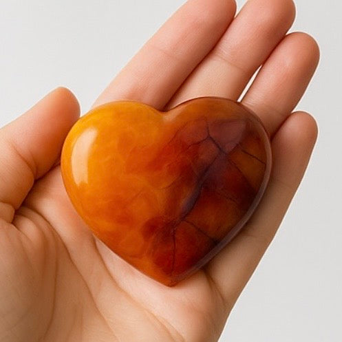A polished carnelian agate (akik) heart carving showcasing rich orange to deep amber tones with natural banding and translucent areas. Each heart is handpicked by us for color intensity, clarity, and overall visual appeal. Subtle variations, internal patterns, and inclusions are part of the stone’s natural beauty, making every piece unique.