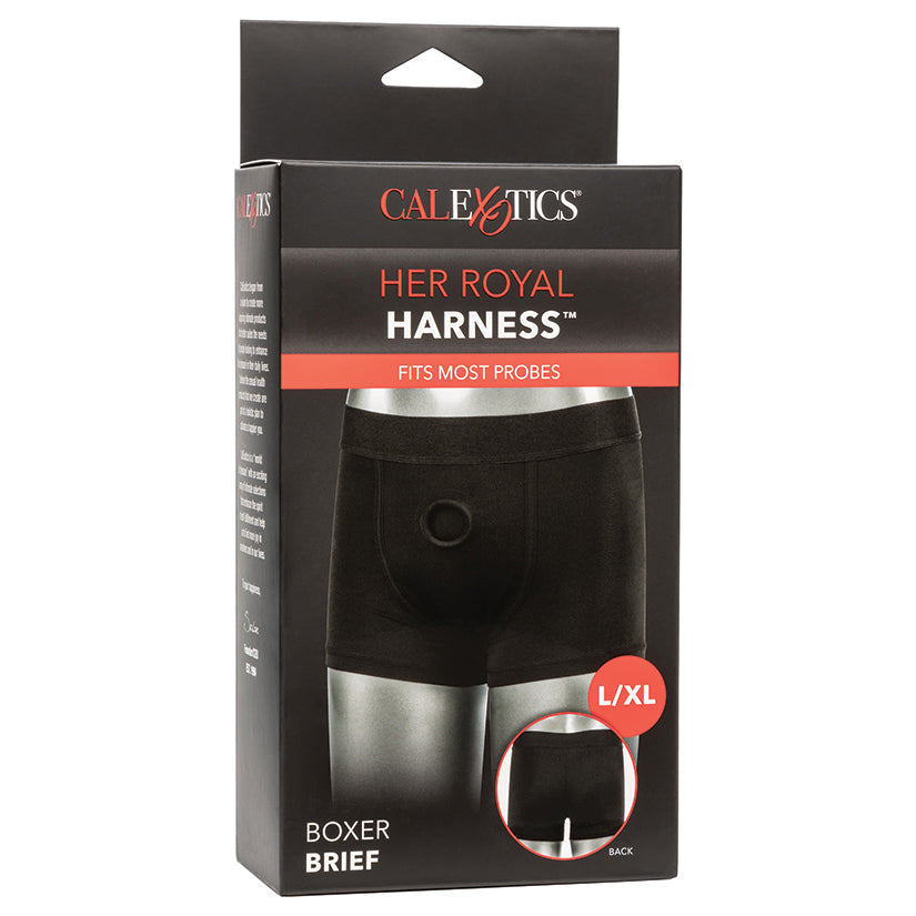 The Her Royal Harness Boxer Brief is an ultra-comfortable, easy wear harness designed with powerful performance and comfort in mind. This classic harness has a supportive extra-wide waistband, soft stretchy material and reinforced O ring for the ultimate support. Enjoy easy access to your favorite probe with the accommodating double panel interior design. The durable, reinforced O-ring stretches to accommodate your favorite probe, packer, vibrator or dildo. Beginners and expert users alike will love frustration-free pleasure with this easy-to-wear harness. Simply secure your favorite probe, slip into the extra stretchy boxer brief style harness and dive deep into passionate penetration or enjoy comfortable all-day wear. Enjoy easy clean up by machine washing and hanging to dry.