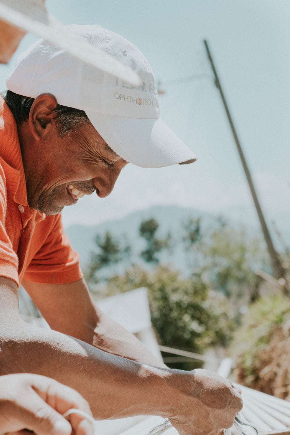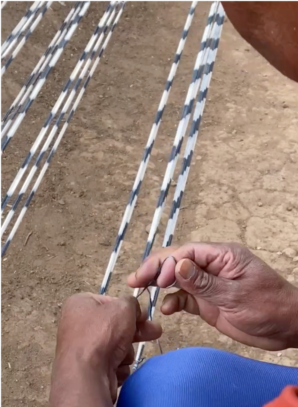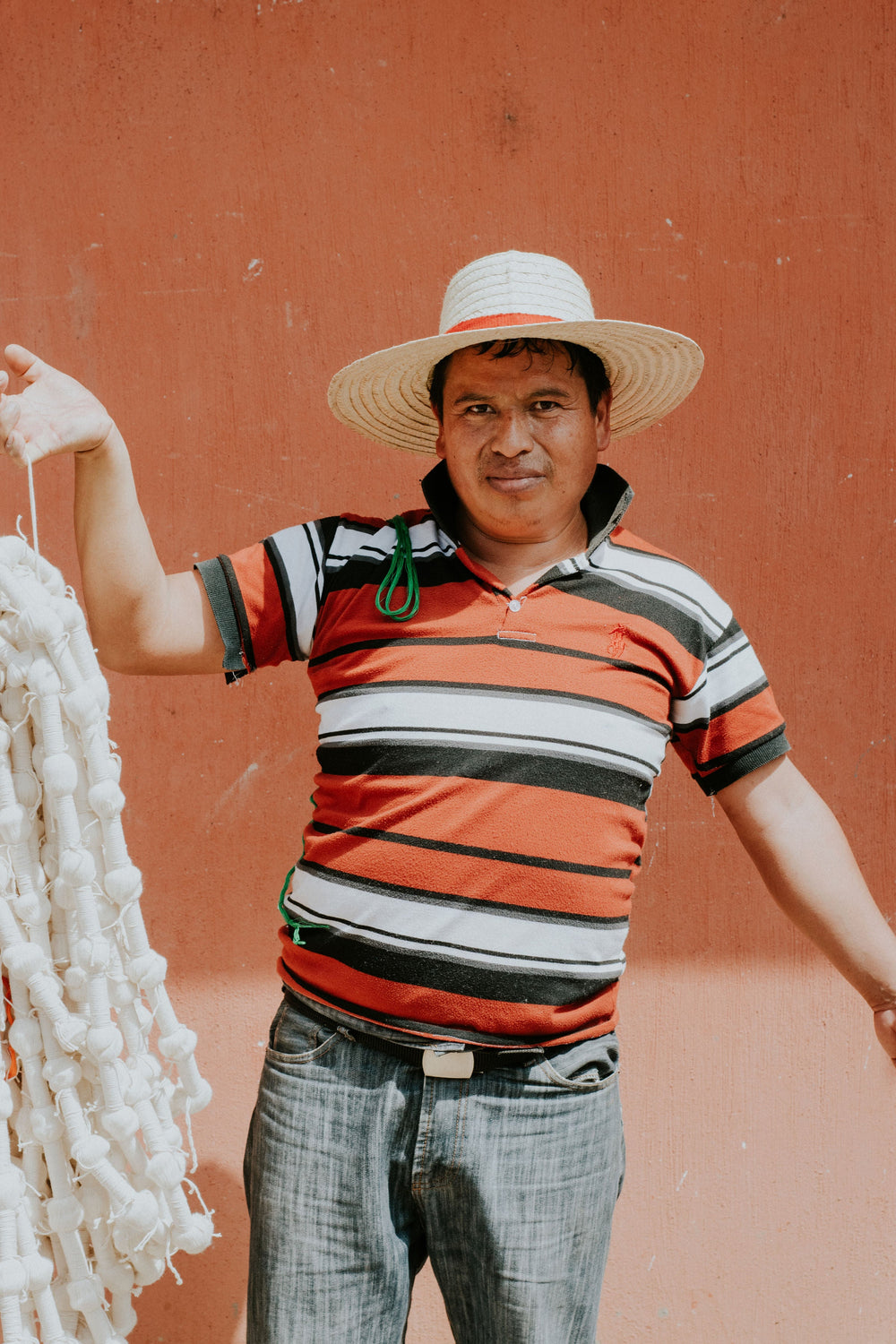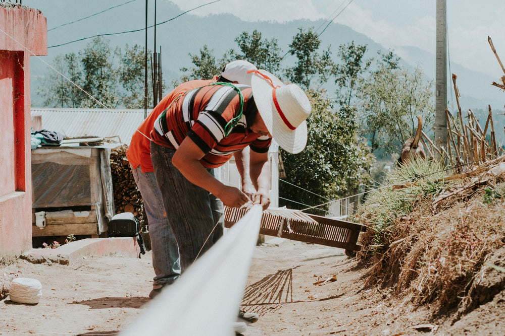 Bold blue and salmon/coral throw pillow, ethically handwoven by artisans in Totonicapan, Guatemala on traditional footlooms. Hand ikat (jaspé) dyed on natural white cotton.