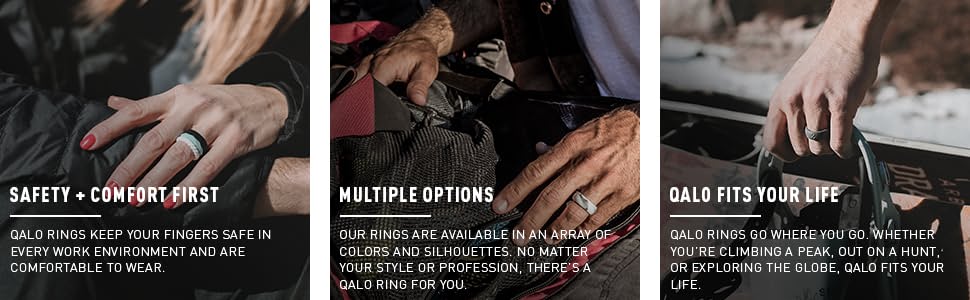 • SPECS - Comfort Fit - 9mm wide, 2mm thick - QALO Comfort Fit Rings fit run true to size, half sizes should size down. Please reference sizing guide for best fit.